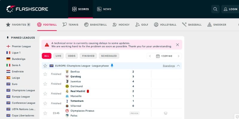 Flashscore là nền tảng quen thuộc với người dùng toàn cầu nhờ khả năng theo dõi nhiều giải đấu và trận đấu cùng lúc. Với độ phủ sóng cực rộng, đây là công cụ lý tưởng nếu bạn cần tra cứu tỷ số ở cả giải lớn lẫn nhỏ.